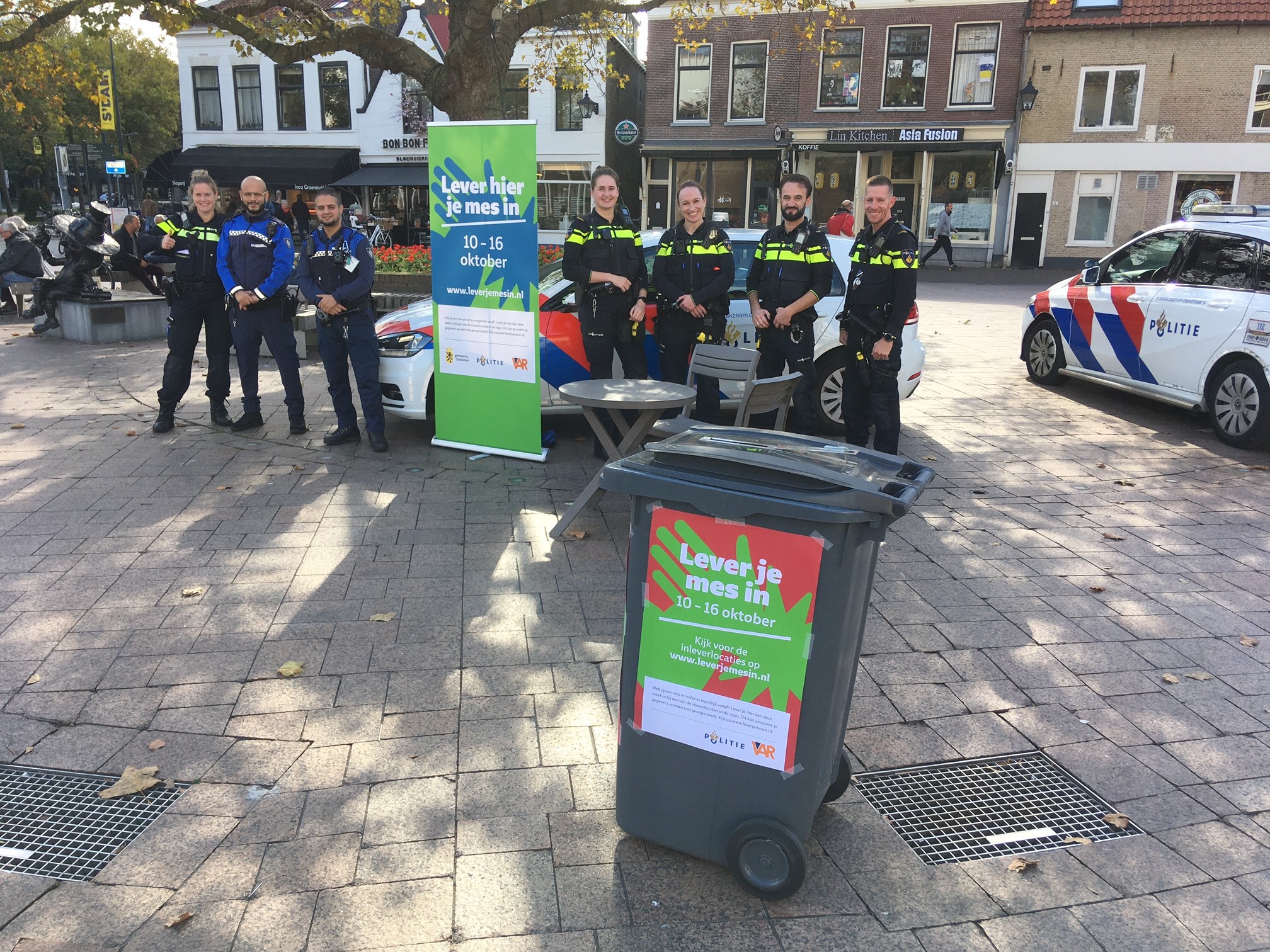 Sanne Reijnhout (geheel links op de foto boven) heeft een tafel met stoelen opgezet op het Land van Belofte, waar zij tot ongeveer halfvier vanmiddag zal zijn. Haar collega's van de ochtenddienst zijn inmiddels afgelost door de middagdienst en de boa's doen hun ronde door de stad. Sanne Reijnhout: "Ik geloof niet dat het hier op het plein nu storm zal gaan lopen met mensen die inleveren, maar het kan echt anoniem. Ik houd me hier vanmiddag bezig met mensen die met me willen kennismaken. Zo slaan we twee vliegen in één klap."