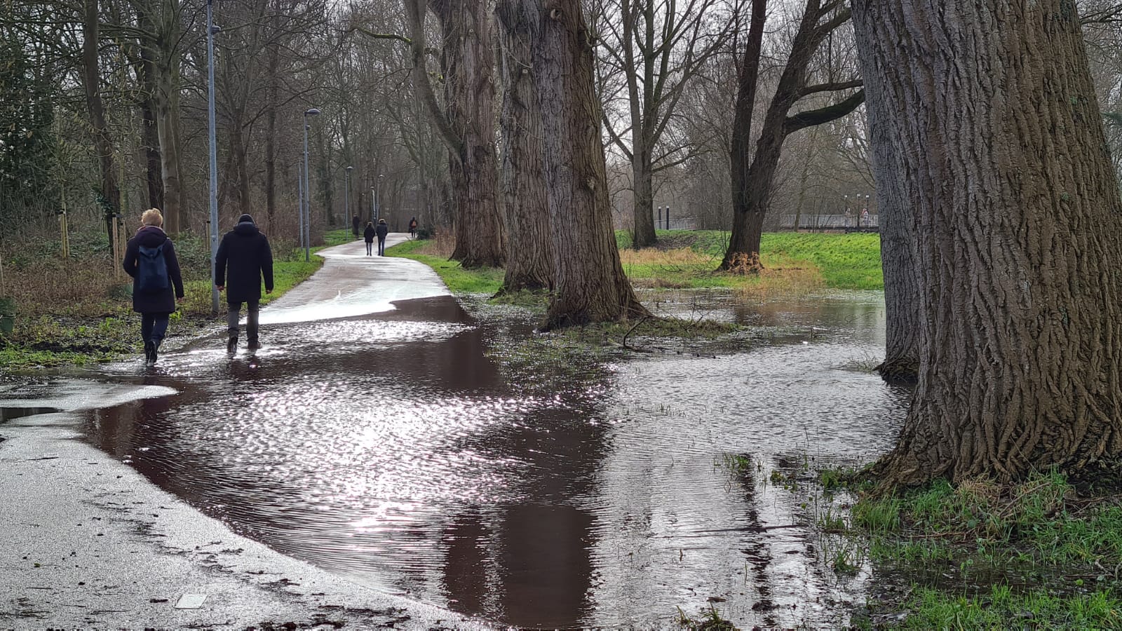 Ook op diverse plekken in het park staat water op de grasvelden.