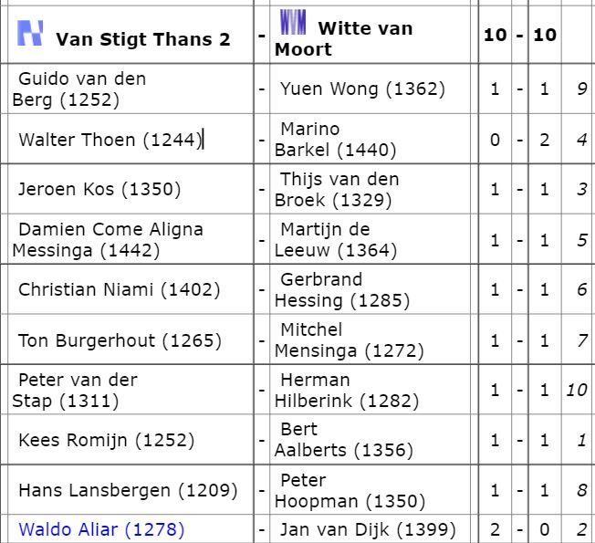 Ondertussen deden de andere twee teams van Schiedam zaterdag ook goede zaken. Het derde won van VAD. Het tweede, dat met hetzelfde rijtje tegenstanders bezig is als het eerste, maar precies een ronde eerder, haalde het eerste punt binnen. Waldo Aliar speelde tegen Jan van Dijk. Een speler, die houdt van combineren en daarvoor ongelooflijke risico's wenst te nemen. Ditmaal maakte hij het te bont. Hij liet een schijnbaar te dure afwikkeling toe. Verrassend genoeg resulteerde dat via bijofferen van twee extra stukken in een rondslag, waarbij vrijwel al het materiaal van Jan van het bord ging. Altijd leuk voor de toeschouwers dat gekletter van de schijven tijdens het uitvoeren van een rondslag.