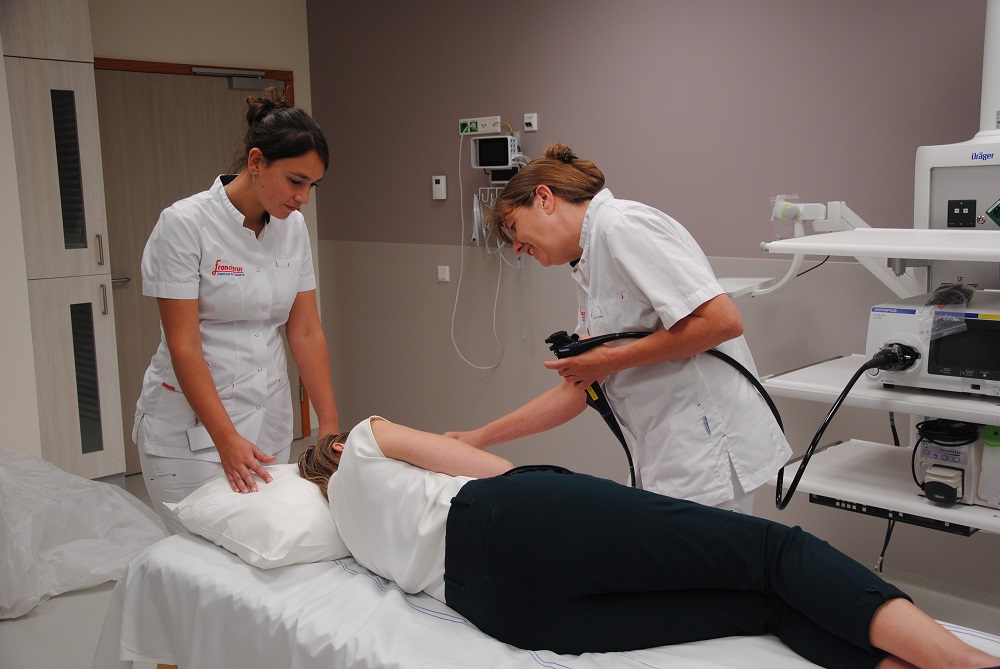 Endoscopieverpleegkundige Marit Lewis: ‘Poliepen bevinden zich voor 99,9% op of in de dikke darm. Dat is dan ook het epicentrum waar dit centrum onderzoekt. Een schoon endoscopisch onderzoek houdt in: geen poliepen. Omdat een poliep er vijftien jaar over doet om te groeien, kan de cliënt dus ademhalen. Nu nog is er een aanzienlijke wachtlijst, als die tot de verleden tijd behoort is het mogelijk om over bijvoorbeeld een jaar of zeven opnieuw te testen. Hierdoor kunnen we veel maagkankers vóór zijn of in een vroegtijdig stadium behandelen. Kleine poliepen kunnen we ter plekke en direct verwijderen. Indien de zaak gecompliceerder wordt komt er direct een chirurg en/of een anesthesist bij.