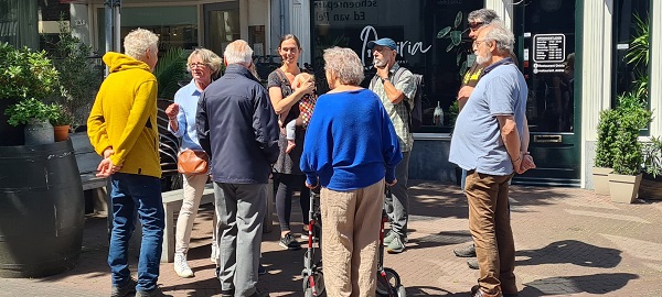 Foto onder: gids Nico de Vries (derde van rechts) tijdens een eerdere wandeling van de HVS, de zogeheten Hoogstraat-wandeling (foto door Louise Melchers)
