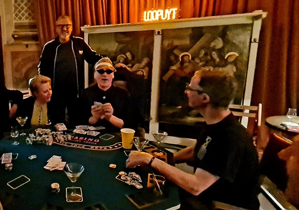 Foto's: foto boven: de linkerdame op de foto is te herkennen als het model op de bekende poster van Loopuyt, tweede foto: aanschuiven aan de blackjacktafel, derde foto: Jack in gesprek met een andere bekende Schiedammer, JW