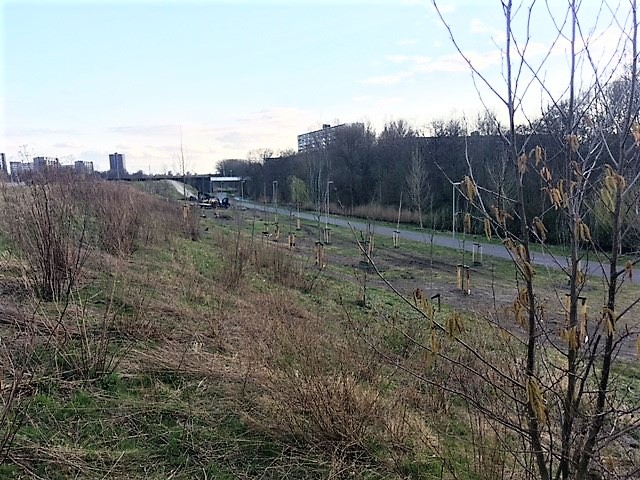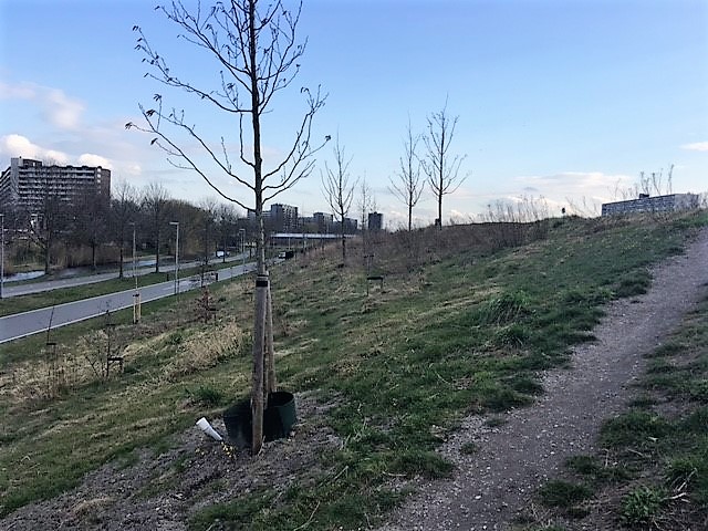 Het gebied met de nieuwe aanplant krijgt een nieuwe naam te weten Amaliapark. Bomen worden zowel aangeplant aan de Schiedamse kant (foto boven) als aan de kant die tegen Vlaardingen aanligt (foto onder).