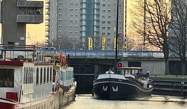 Foto: de Buitenhaven met op de achtergrond de Buitensluis (archieffoto De Schiedammer Online, foto door Louise Melchers)