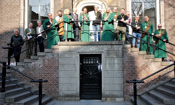 SCHIEDAM - Na afloop van de ceremoniële benoeming van nieuwe gezellen en ridders van Jenevergilde 'het gulden Glaasje' vrijdagmiddag in de trouwzaal van het oude stadhuis werd er even tijd gemaakt voor een bordesfoto, met als publiek de goed gevulde terrassen op deze zonnige vrijdagmiddag.
