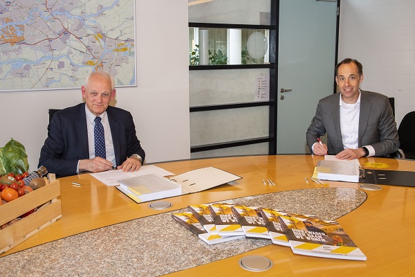 Deze week tekenden Burgemeester Lamers namens de gemeente Schiedam en Martin de Jong (rechts op de foto hieronder) namens ontwikkelaar/bouwbedrijf Van Wijnen een koop- en procesovereenkomst met betrekking tot de herontwikkeling van het Dirkzwager-terrein in Schiedam.