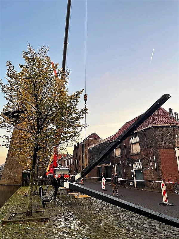 SCHIEDAM - Er wordt nu gewerkt bij Molen De Vrijheid op de Noordvest. De wiekenroeden, die een lengte hebben van bijna 27 meter, worden met behulp van een hijskraan op de molen geplaatst. De plek waar wordt gewerkt is afgezet, maar het verkeer kan er voorzichtig langs.