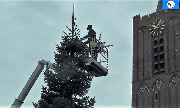 SCHIEDAM - De traditionele kerstboom op de Grote Markt Schiedam op het plein voor het oude stadhuis staat en is vanochtend voorzien van de lichtster die in het puntje van de boom zal branden.