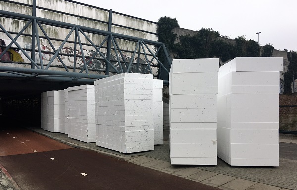 Deze piepschuimblokken komen te liggen onder het nieuw te bouwen clubhuis van handbalvereniging DWS in sportpark Thurlede.