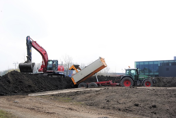 Tractoren met aanhanger rijden af en aan met grond die wordt gestort op een terrein dat van de Gamma komend in de bocht die de 's-Gravelandseweg vervolgens maakt aan de linkerhand ligt.
