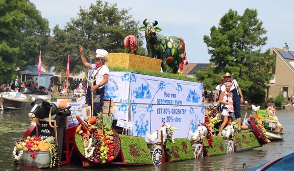Foto: een deelnemer aan het Varend Corso benadrukt het belang van duurzaam eten (archieffoto door Gert Struijs van Varend Corso 2018)