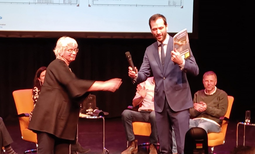 Foto's: Bart Bikkers, wethouder van Vlaardingen, ontving het eerste exemplaar van het Magazine Blankenburgverbinding Maasdeltatunnel uit handen van Helene Moors, projectdirecteur Bouwcombinatie Baak. Elke bezoeker kreeg een magazine mee naar huis (foto door Gert Struijs)