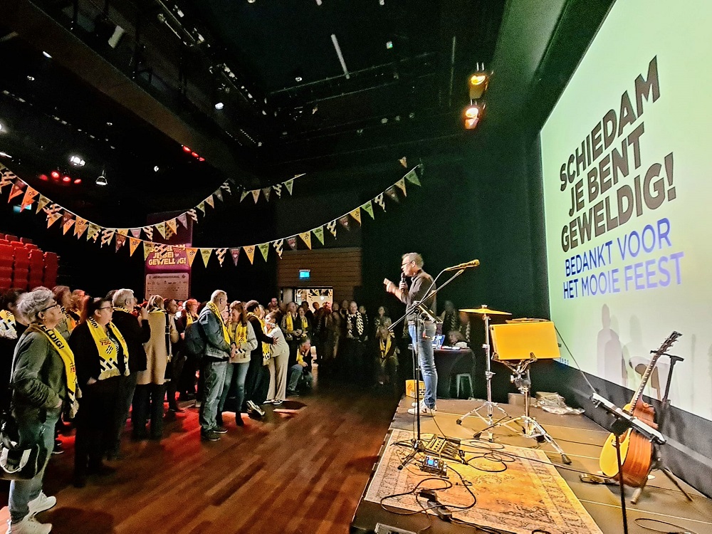 Het Wennekerpand was afgeladen donderdagavond. Bijna alle betrokkenen waren bijeen om de finissage, zeg maar het besloten eindfeest, te vieren van het feestjaar Schiedam 750 jaar stadsrechten.