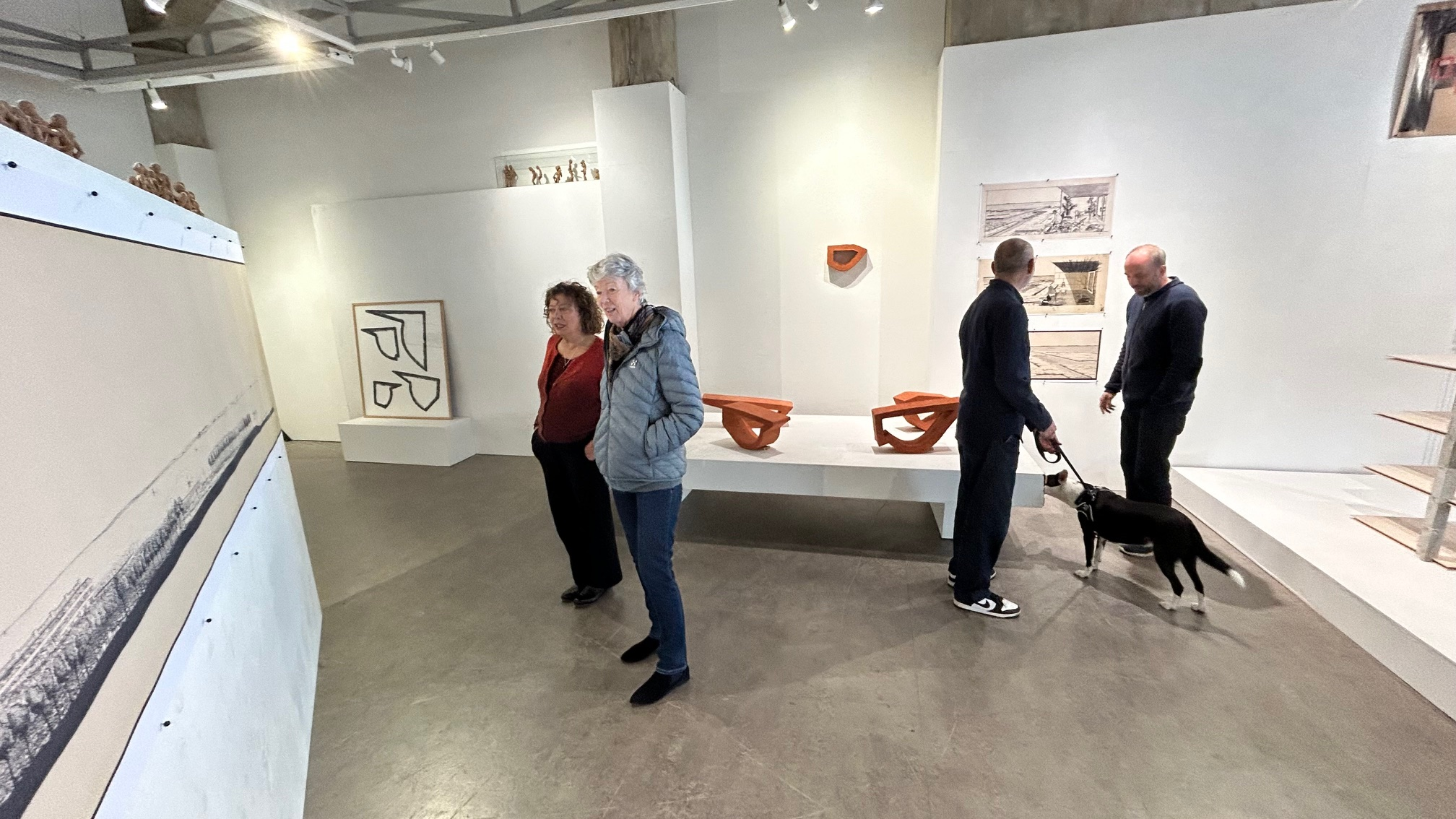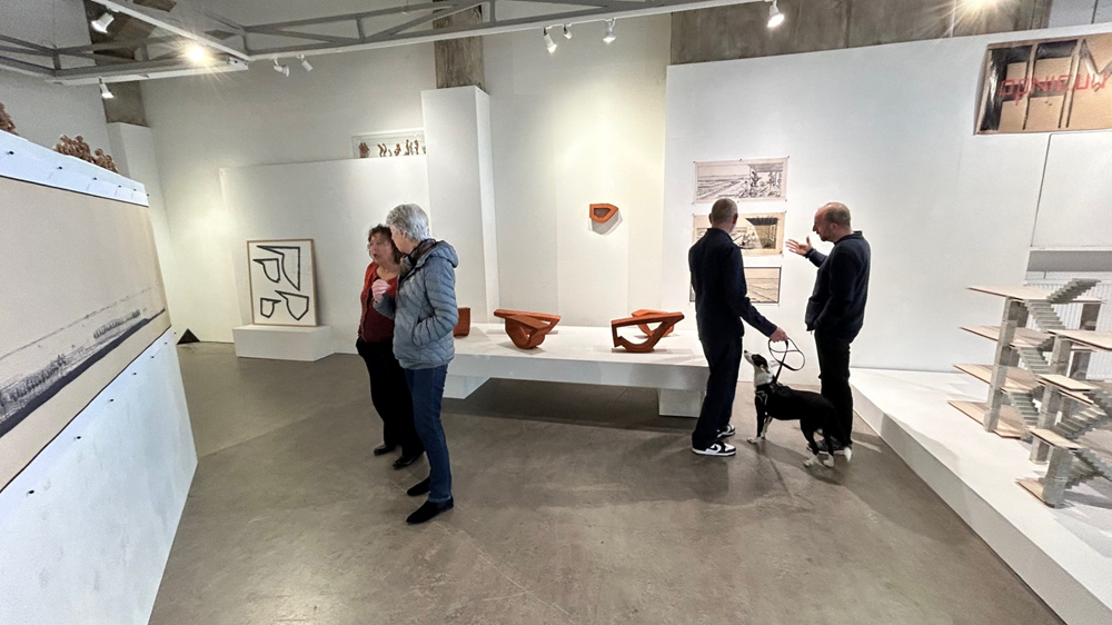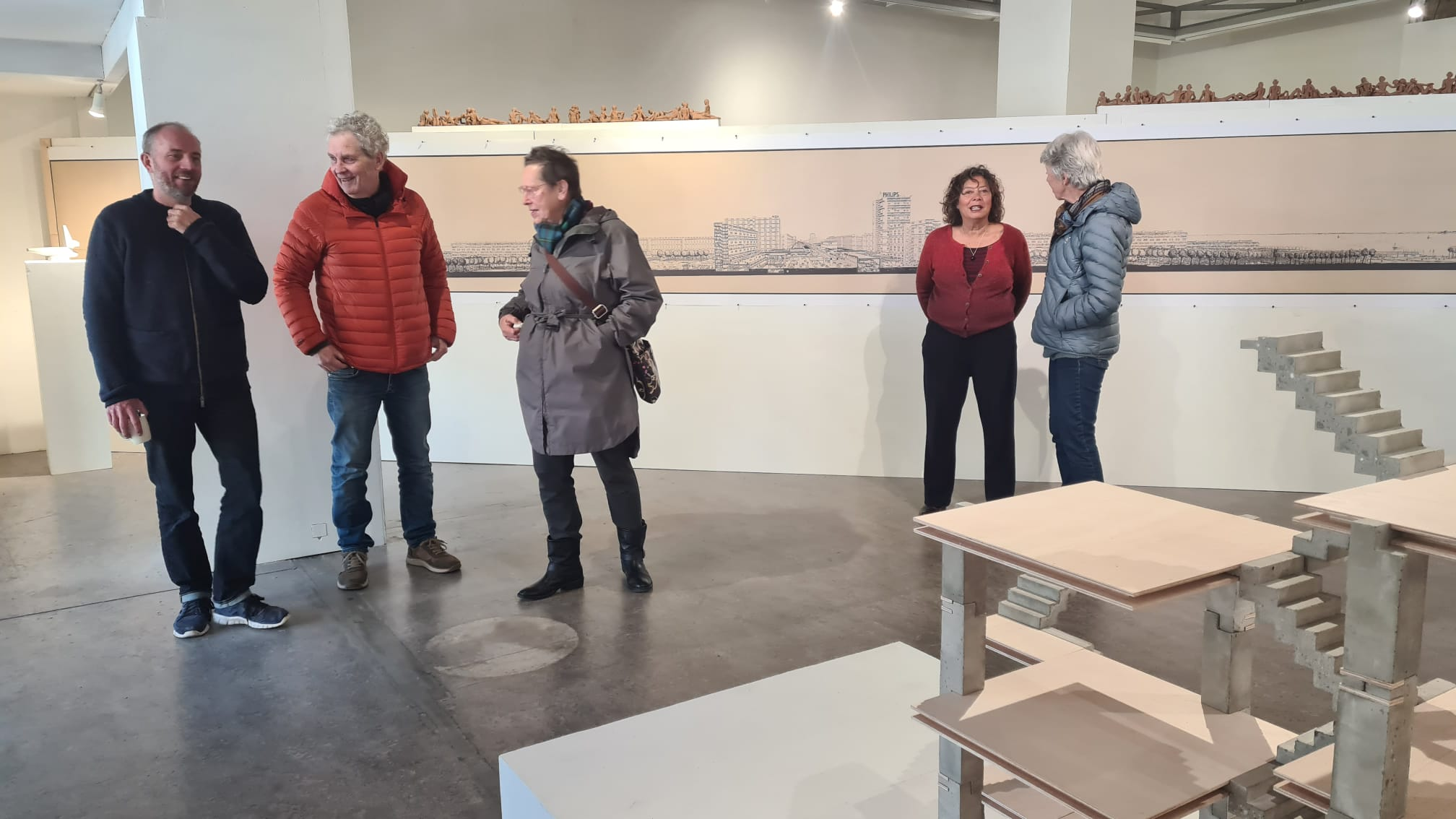Hieronder zie je hoe Willem Besselink en een van de bezoekers, de Rotterdamse architect René Onsia, aandacht hebben voor details van de 9 meter brede tekening, te weten het split-level idee in door Frans Hooykaas getekende appartementengebouwen. Dit split-level idee zie je ook terug in het bovengenoemde/getoonde kunstwerk van Besseling.
