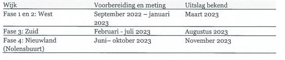 Als eerste mogen de bewoners van een groot deel van de wijk West hun mening geven. De uitslag van de meting wordt verwacht in het voorjaar van 2023. Daarna volgen de wijk Zuid en een deel van de Nolensbuurt in Nieuwland.