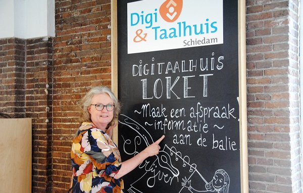 “In 2021 heeft de Gemeente Rotterdam op succesvolle wijze aandacht gevraagd voor Taal met een grootscheepse campagne onder de noemer Jaar van de Taal. Dat heeft de gemeente Schiedam opgepikt en samen met de bibliotheek opgepakt. Je hebt als burger basisvaardigheden nodig om je staande te kunnen houden in de samenleving. Laaggeletterdheid komt vaak ter sprake, maar er is ook iets als ‘laaggecijferdheid’. We zullen niet alleen moeten helpen bij het ontwikkelen van leesvaardigheid, maar ook bij het opdoen van digitale vaardigheden en financiële vaardigheden, en als onderliggende basis hiervoor ook bij het trainen van rekenvaardigheden. Daarom hebben we de naamgeving iets veranderd ten opzichte van het Rotterdamse initiatief. In Schiedam noemen we het: Jaar van Taal & Tools. Dat geeft de breedte aan en het bekt nog lekker ook”, zegt Monique Verweijmeren (foto onder) van de Bibliotheek Schiedam.