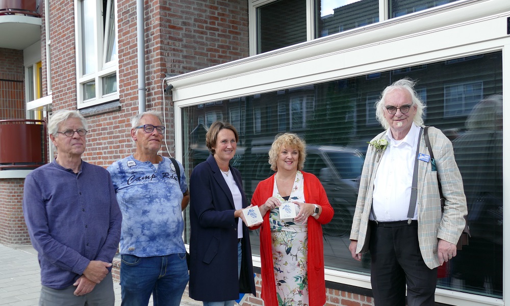 SCHIEDAM - Afgelopen zaterdag werden twee flatgebouwen aan de Lorentzlaan door de Historische Vereniging Schiedam (HVS) onderscheiden. Eigenaar WoonPlus kreeg de ereschildjes uitgereikt. Op de foto hierboven V.l.n.r. Rikkert Wijk (werkgroep HVS), Aad Verbeek (werkgroep HVS), Sigrid Kapsenberg (WoonPlus), wethouder Petra Zwang en Han van der Horst (voorzitter HVS). Hieronder zie je een videoreportage door Jan Willem de Boer en kun je de documentatie over het project en de motivatie van de uitreiking lezen.