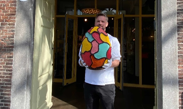 SCHIEDAM - Chocolatier Connor Klein maakte dit veelkleurige mega-chocolade-ei dat zich moeilijk laat verstoppen. Je kunt het winnen door te raden hoe zwaar het is.
