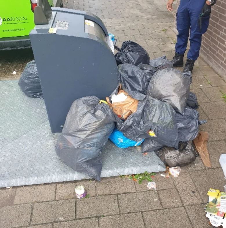 SCHIEDAM - Deze hopeloze hoop vuil is op zondag door de afdeling Toezicht & Handhaving van de gemeente verwijderd en uitgeplozen. Drie foutieve bijplaatsers konden daardoor achterhaald worden. Zij krijgen elk een bekeuring van 150 euro.