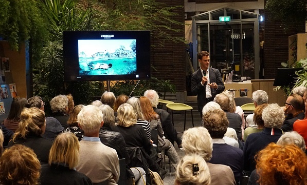 Ecoloog Ernst Raaphorst en ontwerper Lucas Zoutendijk kwamen aan bod in een tweegesprek onder leiding van presentatrice Marion Keete, al 23 jaar verslaggeefster bij RTV Rijnmond. Lucas Zoutendijk vertelde over zijn ontwerpen, zoals een op het water gericht ontwerp in Rotterdam, de 'eendenstraat'. Dat is een tijdelijk bouwwerk in het water dat leuk is om te zien en waar watervogels en andere dieren kunnen huizen. Op de vraag van Keete waar een ontwerp van hem in Schiedam toepasbaar zou kunnen zijn, kwam niet echt een antwoord, behalve dan dat ze erop kwamen dat er tussen Overschie en Schiedam in de Schie 'een gek bruggetje' ligt, dat voor fietsers als 'toegang tot natuurgebied Midden-Delfland' gezien kan worden. Het Schiedamse publiek voelde feilloos aan, dat Keete en Raaphorst niet bepaald thuis zijn in Schiedam en dat zij de Rolbrug bedoelden. Deze brug dateert uit 1882 en verbindt de Overschieseweg in Rotterdam met de Polderweg in Schiedam Kethel.