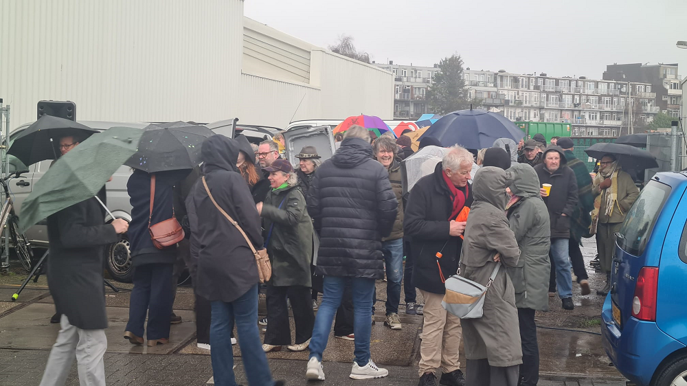 Dat alles voor naar schatting vijfhonderd man, vooral Schie- en Rotterdammers, maar ook van ver daarbuiten. Die van daarbuiten wisten onze stad goed te vinden, want daar is altijd de onvervalste topoles van Jules Deelder: Beknopte topografie van de Rijnmond, Rotterdam, Schiedam, Vlaardingen, Maassluis, hoekie om, trappie af gekkenhuis.