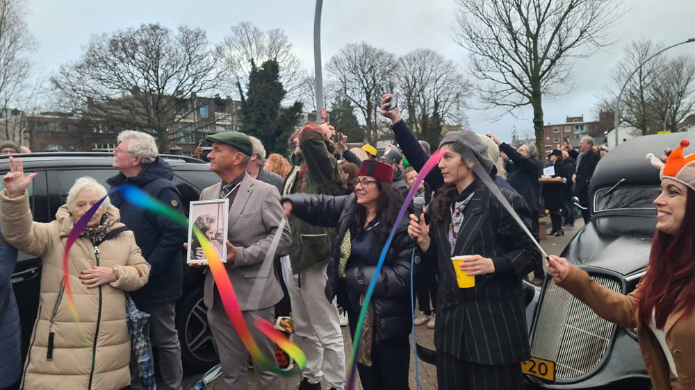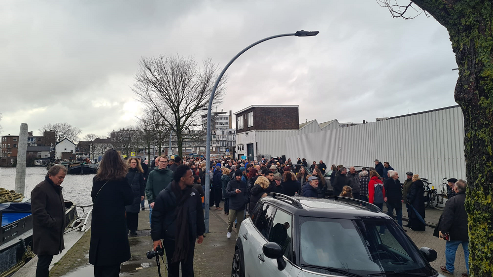 Een ontroerend maar onverbiddelijk duidelijk spandoek op de kade. 'JFK JACK Schiedam 1960 2026' luidt de tekst. De context: kleur Deelder-zwart, Jules' dochter Ari en partner Annemarie Fok dragen het. Het zegt veel over wat JFK betekende voor Jules Deelder vice versa.