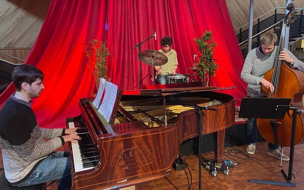 Tijdens het Lunchconcert van vandaag stond het jazztrio van pianist Jan Domènech op het menu. In januari was dit trio al tijdens een livestream Lunchconcert te zien, maar vanmiddag kon het publiek de formatie live zien en horen.