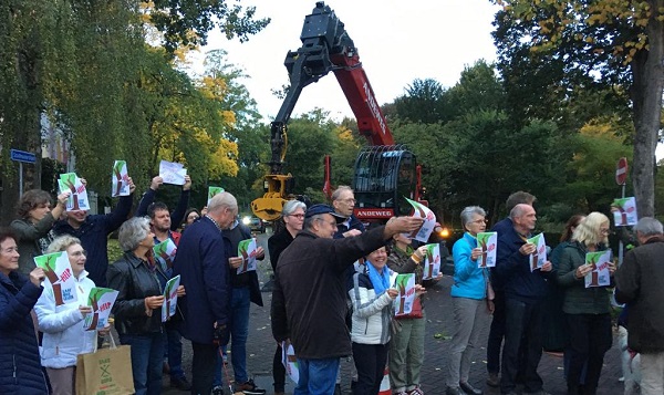 De demonstranten hadden een lint gespannen over de Stadshouderslaan. Aan het lint waren de in opdracht van de Bomenridders door Theo Gootjes ontworpen posters gehangen. Een van de demonstranten had onder de grijper zijn bakfiets geparkeerd.