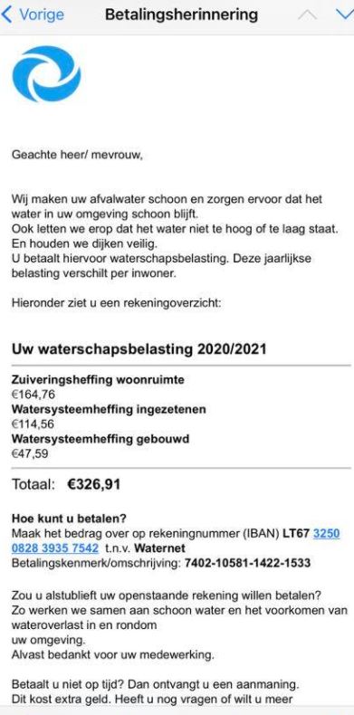 De oplichters die de valse factuur sturen, hebben de tekst gekopieerd van de door Waternet in 2020 verstuurde nota. De tekst komt in grote lijnen overeen met de originele tekst en de weergegeven bedragen kloppen. Wat er niet klopt is dat de oplichters het over de belasting 2020/2021 hebben. In de echte nota die mensen in de regio Amsterdam krijgen wordt gesproken van belastingjaar 2020.