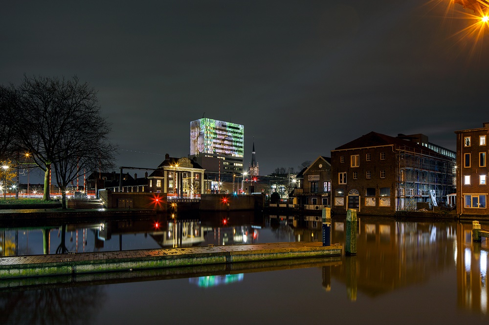 ‘Lichtprojecties zijn altijd bedacht door kunstenaars of designers, hier in Schiedam komt de inhoud van de bewoners zelf. Je ziet hun foto’s. Dat heb ik nog nooit ergens gezien.’ Campmans weet dat het ook technisch een primeur is. ‘We projecteren op de toren van het Stadskantoor vanaf Molen De Kameel, een afstand van 150 tot 200 meter. Dat is niet eerder gedaan. ‘Er was een test in Londen, dus het leek technisch mogelijk, maar de Nederlandse distributeur van de projector was sceptisch. ‘Uit technische berekeningen bleek dat het moeilijk zou zijn. Uiteindelijk bleek tijdens een proef in Schiedam dat het werkte.’