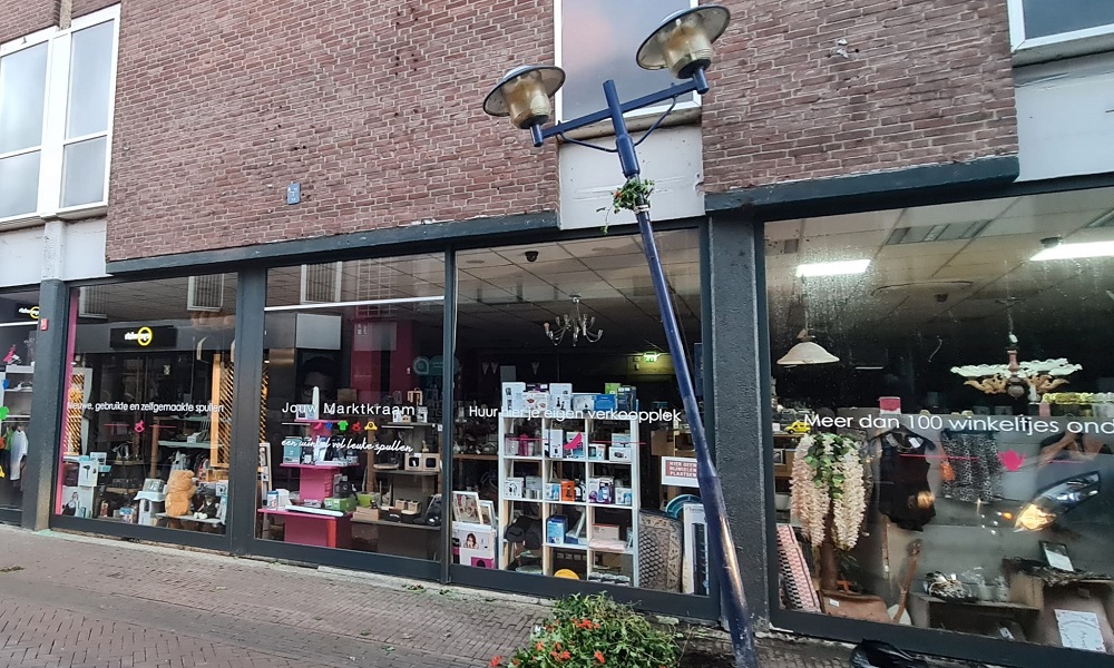 SCHIEDAM - Vanmiddag is een lantaarnpaal op de Hoogstraat zodanig geraakt dat deze scheef is komen te staan en de bloeiende geraniums op de grond zijn terechtgekomen.
