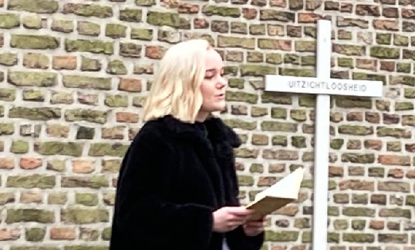 Foto: Lisa McIlveen laat via door haarzelf geschreven Spoken Word horen hoe hedendaags lijden eruitziet in het licht van Pasen; cameravrouw is Charlotte Meijer (foto door Marijn Poel-van Rijswijk)