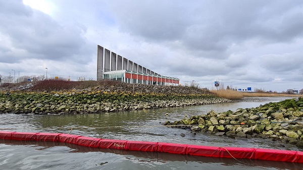 SCHIEDAM - Aan de ingang van de Nieuwe Maas naar de Vijfsluizerhaven in Schiedam is een plasticvanger aangelegd om het plasticafval uit de haven te houden.