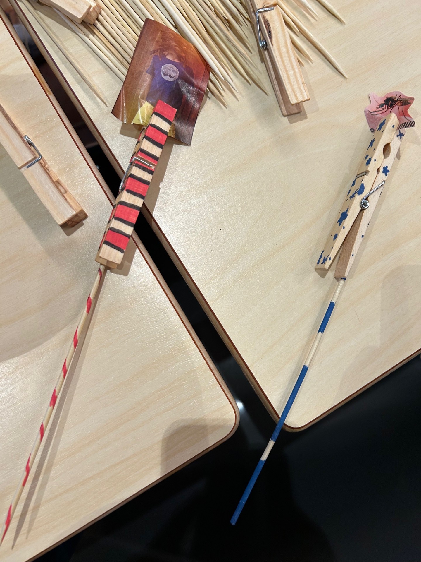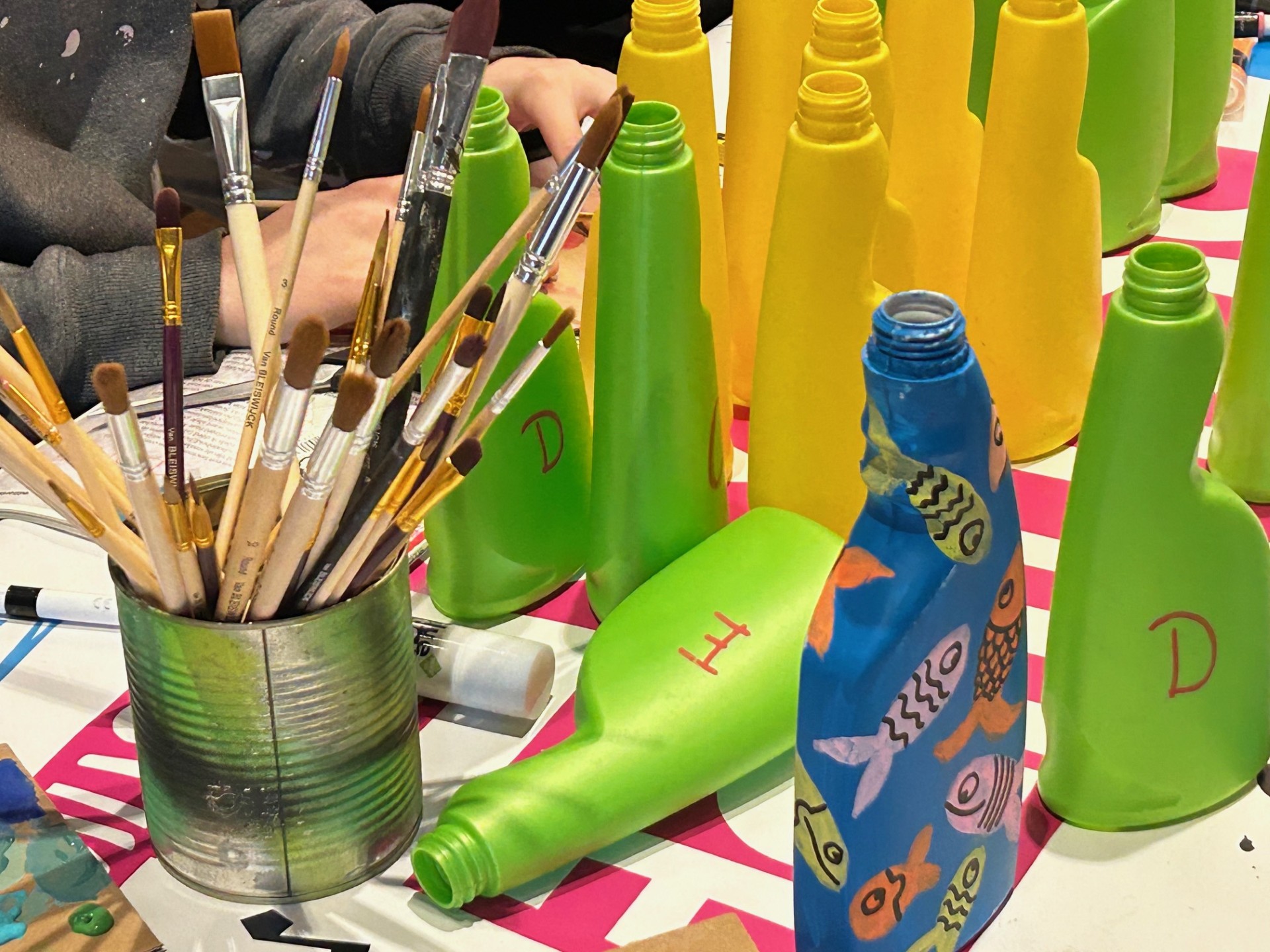Hieronder zie je enkele voorbeelden van het knutselwerk van de leerlingen, met als doel hen bewust te maken van het feit dat er soms alternatieven zijn voor het weggooien van dingen. Van een oud t-shirt is een tas te maken, met een stokje en een knijper kun je een fotostandaard maken en een gebruikte schoonmaakmiddelfles kan leuk versierd worden.