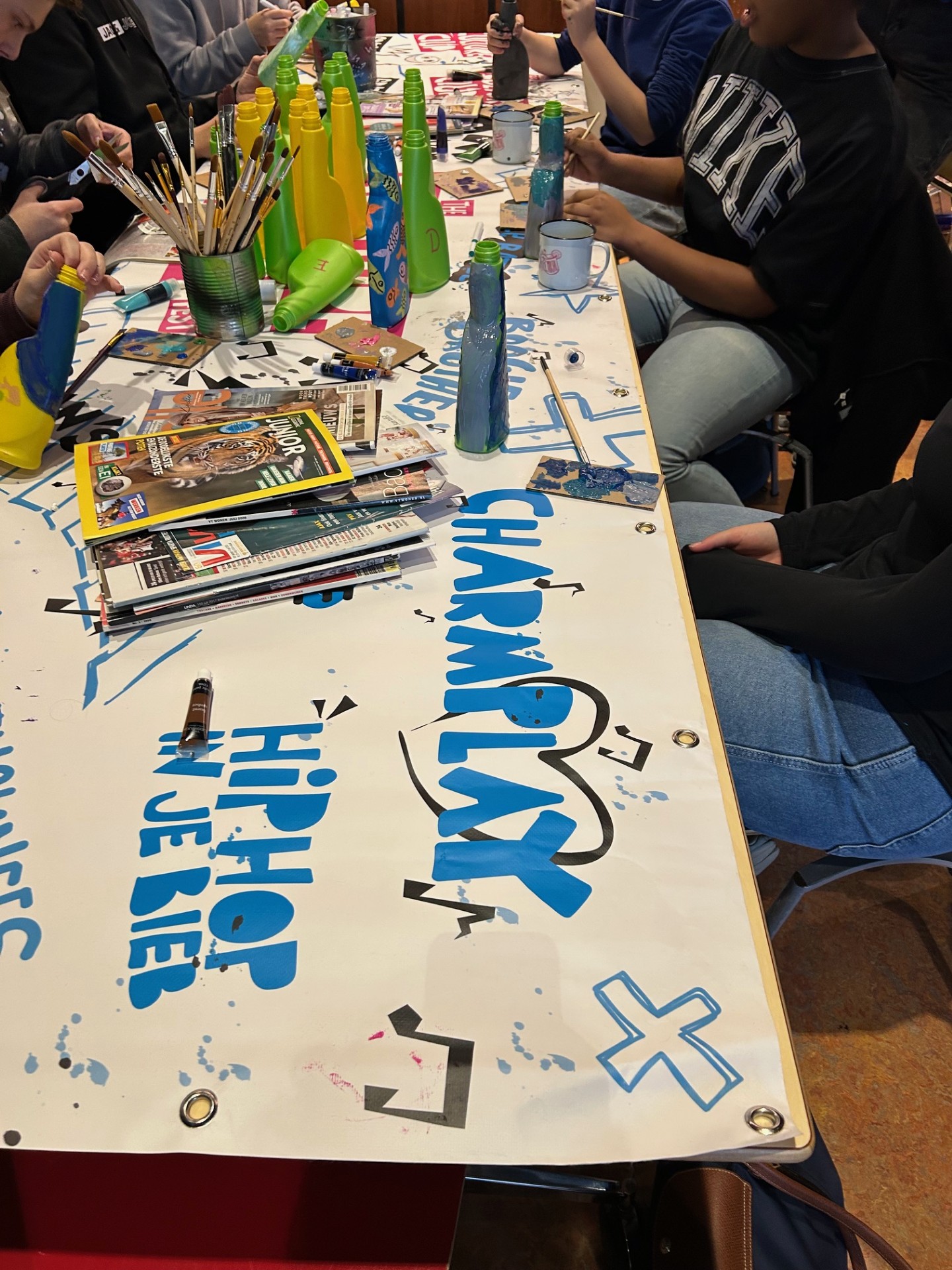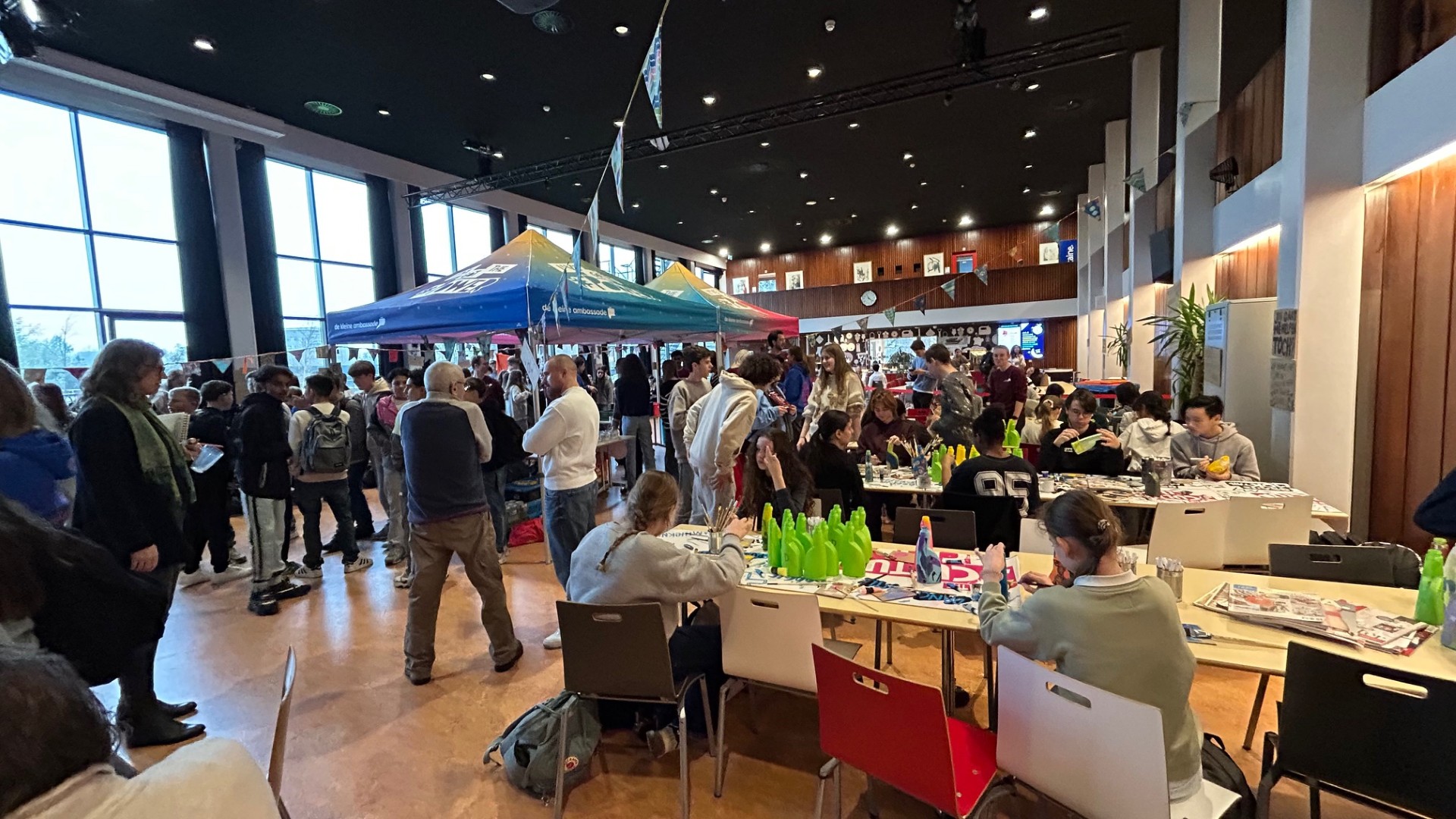 Voor de vrijwillige reparateurs van Repair Café Schiedam was het een bijzondere setting. Met voor zich allerlei kraampjes in de aula waar de leerlingen iets duurzaams konden knutselen, en dat gaf een gezellig geroezemoes, zoals dat niet ongebruikelijk zal zijn tijdens de reguliere CKV-lessen. Met achter zich op het podium 'silent disco' met enthousiast dansende leerlingen. Het hinderde de reparateurs geenszins, zij gingen onverdroten verder met het repareren van onder meer een koffiezetapparaat, een cd-speler, een airfryer en kleding. Ook had zowel een lerares als een leerling kettinkjes ter reparatie gegeven. Ook die priegelklus werd - met een loep in het oog - enthousiast opgepakt. De loep was ook nodig bij het repareren van een rits. Een klusje dat specifiek voor Repair Café @ School is: het repareren van een papieren schoolagenda (zie foto hieronder).