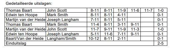 In het afsluitende dubbelspel kwamen Thomas Baart en Martijn van der Heide in de eerste game het eerst op gamepoint, met drie punten op rij ging deze game echter toch naar Joseph Langham en Mark Smith. In de tweede game kwamen Baart en Van der Heide nog op 7-4 voor, maar Langham en Smith kwamen zeer sterk terug en wonnen deze game alsnog en de derde game met ruim verschil. Daarmee werd de eindstand bepaald op 2-5.