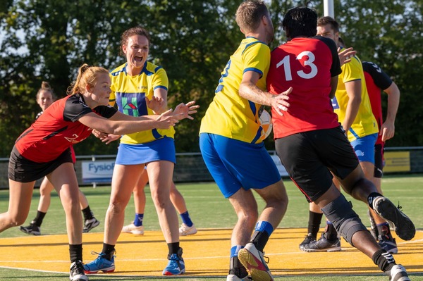 Suthes Balasooriyan wurmt zich langs zijn tegenstander en krijgt de bal aangespeeld door Lisa Stouten.