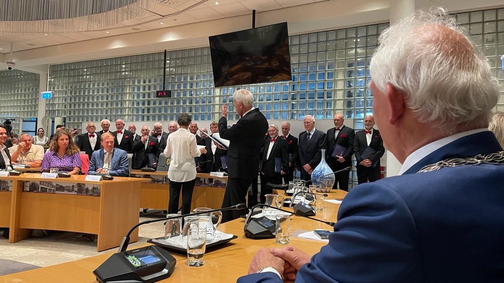SCHIEDAM - Het Koninklijk Schiedams Mannenkoor Orpheus heeft burgemeester Cor Lamers zojuist verrast in de raadszaal van het Stadskantoor met een optreden.
