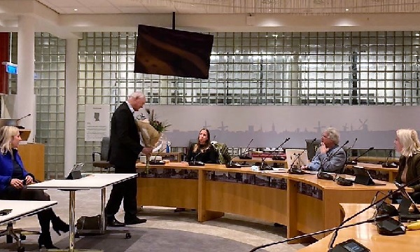 "In #Schiedam gebeuren mooie dingen... Verslaggever @RDStad @SandraDon3 vertrekt naar de digitale poot van @ADnl Een bloemetje namens @schiedam_nl op 1,5 meter", twitterde wethouder Antoinette Laan vanochtend.