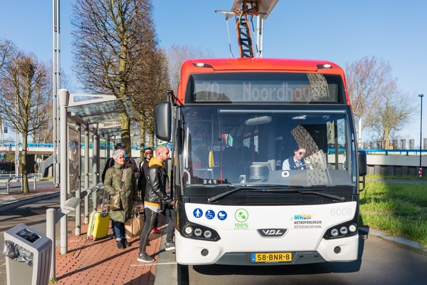 Passagiers stappen in elektrische bus