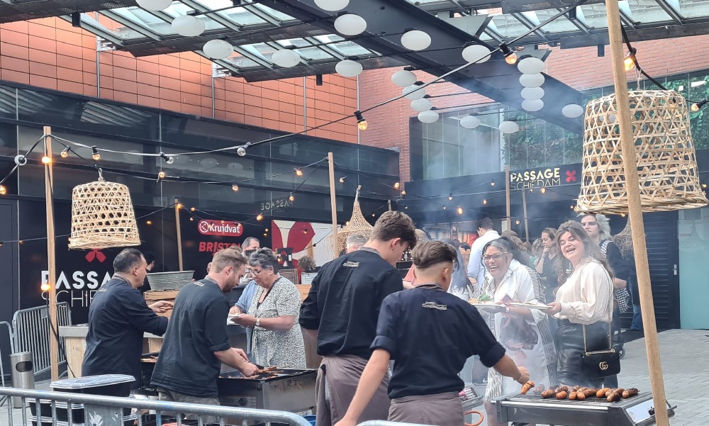Rond een uur of halfzeven 's avonds liepen we vanaf de Koemarkt de Hoogstraat op en kwam de lucht van gebarbecued vlees ons tegemoet, zoals je dat ook kunt hebben als je op een zonnige zomeravond door het Prinses Beatrixpark fietst. Dat de barbecues buiten op de Hoogstraat voor de ingang van de Passage staan, zal echter een unicum zijn. De slagers van Slagerij Jacq Groeneveld stonden persoonlijk achter de rokende installaties om hamburgers, kipsateetjes en nog meer lekkers te bereiden, vergezeld van stokbrood, sauzen en salades. Binnen was het op dat moment aan de statafels plus enkele lange tafels waaraan je kon aanschuiven al een gezellige drukte. Er waren verschillende barretjes, voor fris, bubbels en andere wijnen, bier en ter plaatse gemixte cocktailshotjes.