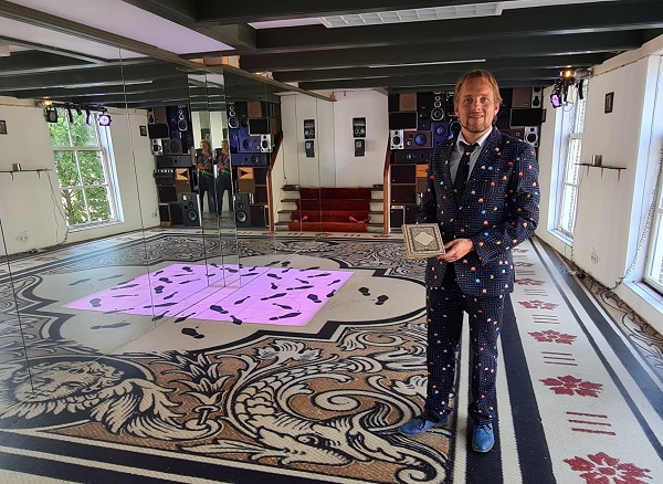 Foto: Op de foto toont Wouter Robers een exemplaar van de bundel Snikken en grimlachjes' ; Corine en Wouter Robers, eigenaars van het pand aan de Lange Haven 141 - het historische pand waar vroeger drukkerij Roelants was gevestigd - hebben op de eerste etage hun eigen ballroom ingericht, met op de vloer een heel bijzonder zeil: het is geënt op de cover van de bundel 'Snikken en grimlachjes' (foto door Louise Melchers), lees meer onder deze link: Je eigen ballroom met 'Snikken en grimlachjes' dansvloer