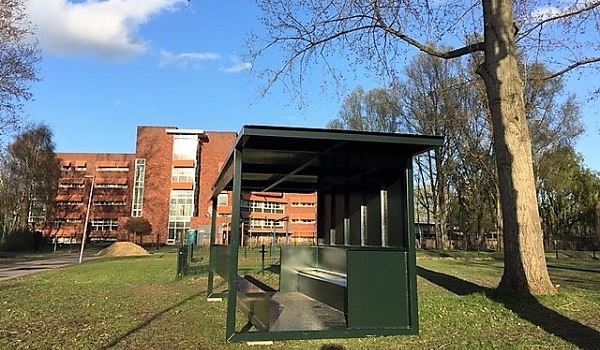 Dit groene hutje is een zogenoemde Jongeren Ontmoetings Plaats (JOP). "Het is een zeer degelijk en robuust gebouw (hufterproof)", zegt de fabrikant ervan, De Groene Mat.