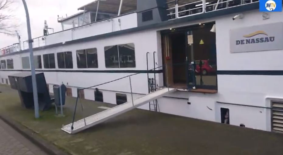 Foto: het schip waarin de vluchtelingen worden opgevangen, De Nassau (fragment uit video JW TV Schiedam, zie afbeelding met pijktje hierboven)
