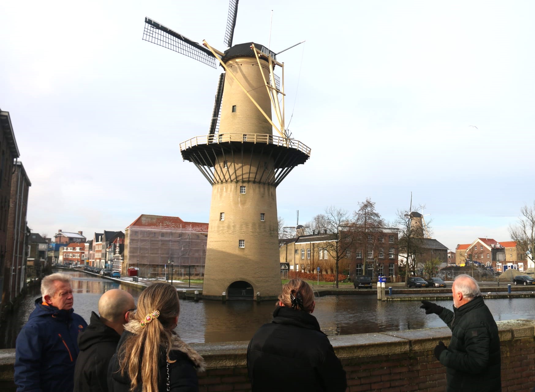 geheel links Rob Vollaard, geheel rechts Rob van der Stel, kijken met enkele deelnemers in een eerdere wandeling vanaf de Proveniersbrug over de Schie en op molen De Kameel en het Dirkzwagerterrein, waar een nieuwbouwbuurt verrijst