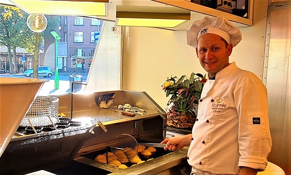 Stond hij in de oude kraam met zijn rug naar het publiek toe te bakken, deze nieuwe kraam heeft hij zo laten inrichten dat hij en de anderen die aan het bakken zijn zicht op de straat hebben. "En dat is wél zo gezellig dat we allemaal nu naar buiten kunnen kijken en contact kunnen hebben met de klanten", zegt Nico Sterrenberg.
