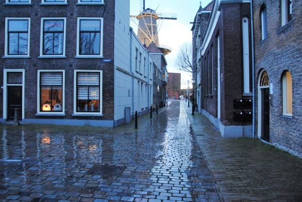 Foto: vanaf de Vismarkt kijk je de Walvisstraat in, met op de achtergrond molen De Walvisch