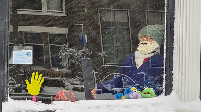 Aan de andere kant van de voordeur van Corine en Wouter zien we achter het raam een kleine kerstboom waar - binnen dus - 'sneeuwvlokjes' dwarrelen.