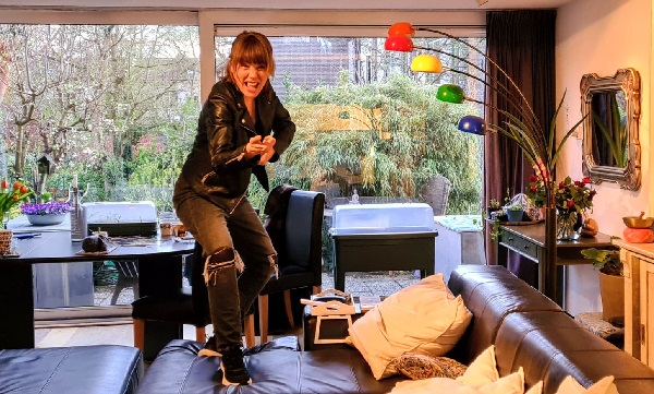 Voor ons is dit helemaal nieuw, theater aan huis, niet online maar helemaal persoonlijk live. We gaan naar de huiskamer en daar geeft Anne Rats instructie voor de indeling. ‘Ik heb alleen een stoel nodig waarop ik ook gitaar kan spelen en natuurlijk anderhalve meter afstand van jullie.’ Binnen no time is het toneel in de kamer klaar. Ze denkt zelfs aan de verlichting. ‘Misschien nog even een lampje aan voor als het straks donker wordt.’