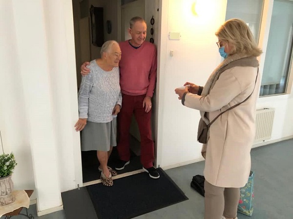 Foto: twee senioren in Schiedam Zuid die gebruikmaken van de behoeftelijnknop; rechts op de foto Mieke Wigmans (foto door Stichting J&S)